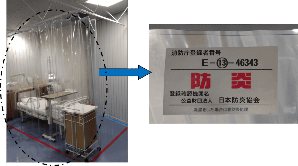 旅館や病院など人命危険の高い特定防火対象物や構想建築物等では、出火延焼防止の観点から、たとえ着火したとしても燃え上がらないようにカーテン、カーペットなどには、消防法第8条の3により防炎製法を有した物品の使用を義務付けています。